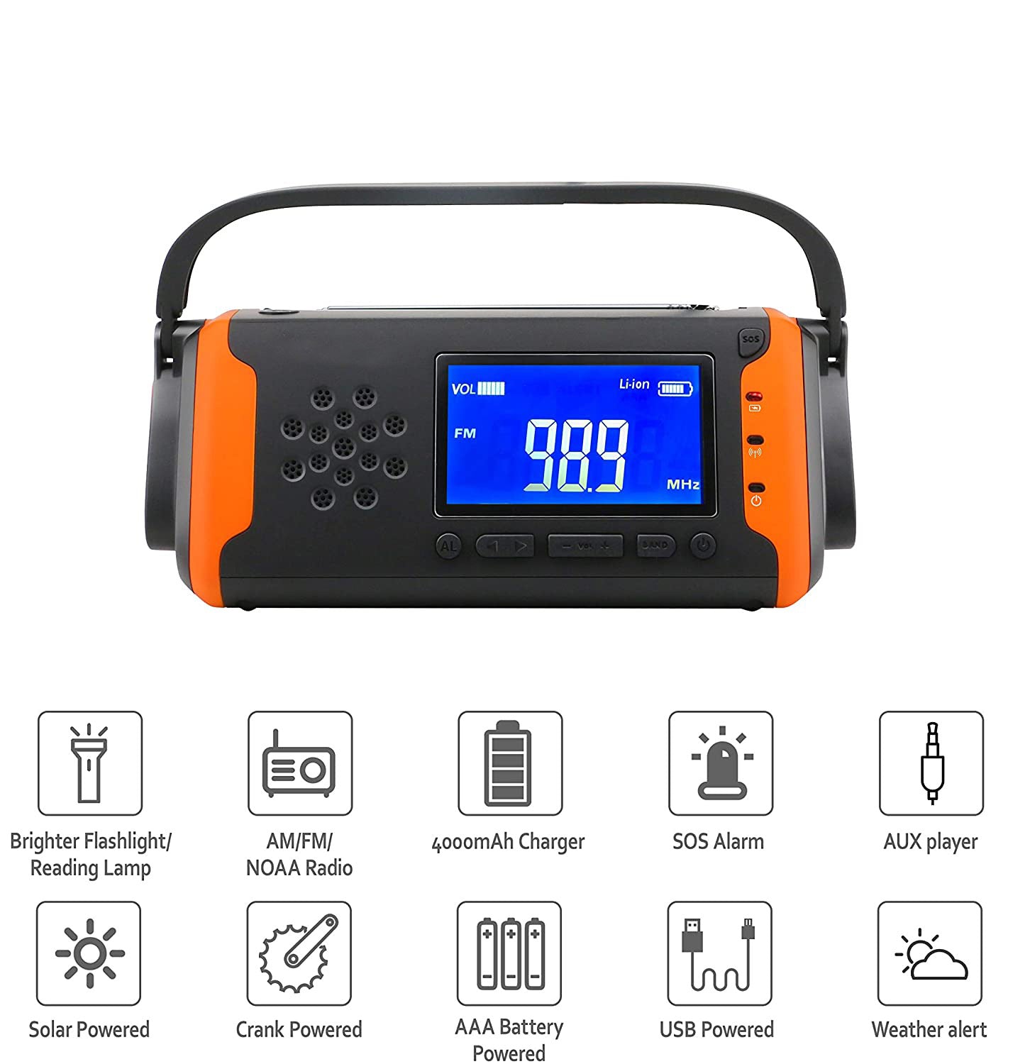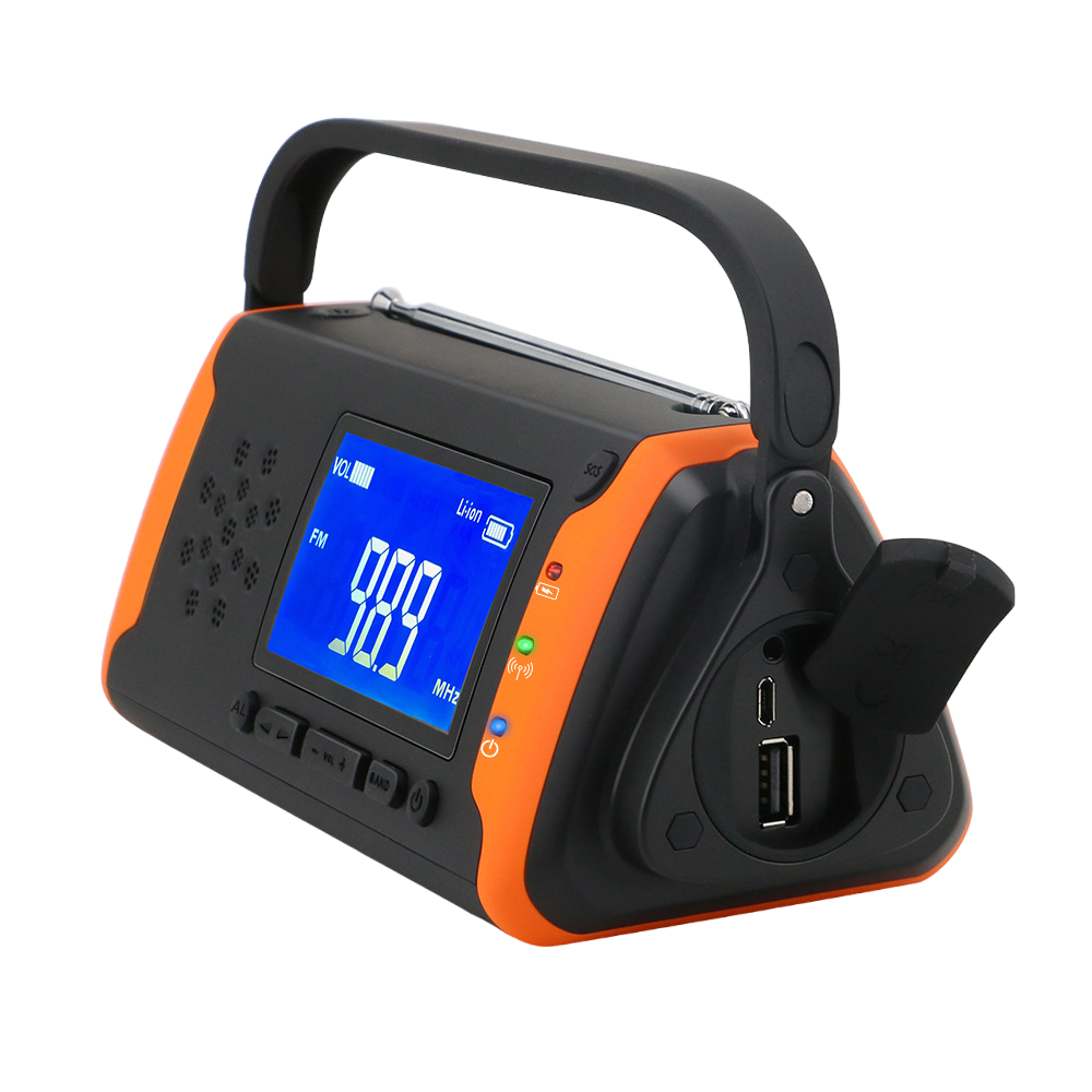 Levereras med radio, datakabel, 1W LED-ficklampa och SOS-siren. Strömförsörjning via solpanel, handvevsgenerator, USB och AAA-reservtorrbatteri.